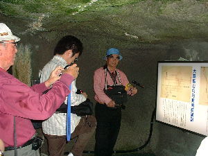 写真は世界遺産の石見銀山(イワミギンザン)龍源寺間歩(リュウゲンジマブ)奥での地元民の解説と取材活動風景です(「間歩=マブ」とは江戸時代に、銀を採掘するために掘った坑道のことです。)