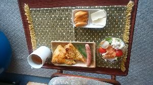ウインナー1本、チーズ2枚、スモーク笹かまぼこ、サラダ、紅茶をストレートで