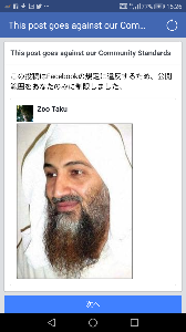 数日前、フェイスブックに「ウサマ・ビン・ラーディン」についての記事を投稿したのだが、数分後に「利用規約に違反していますので公開が制限されます」という内容の通告があり、その通り、記事は非公開となった。何が「規約違反」なのか、まったく理解できなかったので、試しにビン・ラーディンの顔写真だけを投稿してみた。すると直後に再び「規約違反」の通告、そして今回は24時間の投稿制限というペナルティを受けた。何が規約違反なのか、なぜ24時間の投稿制限なのか、その説明はまったくない。