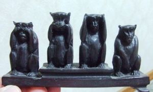 ●●に入る言葉は無論【サル】ですが、三猿でなく四猿、八猿とする説もあるらしく、その場合4番目の『せざる』は股間を押さえています。
