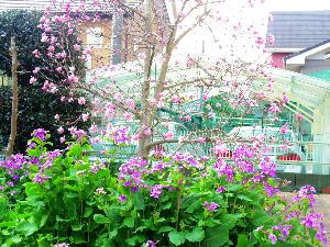 スズメが何時も止まっているコブシと花だいこんの花が咲きました。