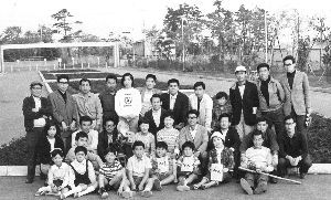 【左から】増田博雄さん(博報堂番組担当)、梅村幹比古さん(国際放映プロデューサー)、山際永三さん(監督)、大槻義一さん(監督)、芦野宏さん(パパ河越順一郎役)、高木由次郎さん(国際放映演技係)or横山さん(博報堂営業)、河島明人さん(浩二役)、馬渕晴子さん(ママ竜子役)、阿部さん(博報堂営業)、大島さん(ブラザー東京支店長)、久世さん(ブラザー常務)、橋本洋二さん(TBSプロデューサー)、市川さん(博報堂営業)、蔵忠芳さん(武役)、?さん(TBS営業)、九重佑三子さん(コメット役)、岡本良介さん(国際放映プロデューサー)、辻さん(ブラザー企画部課長)。