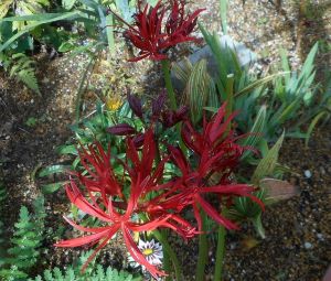 >雨に濡れて勢いを増している変な花奴は、曼珠沙華と遅く咲いたリゴ-リスである