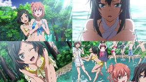 多々あるラブコメで、ヒロインたちの水着姿を披露するイベントとして、プールや海水浴がよくあるけれど、このアニメ(1期)では、キャンプ場わきの河原が舞台となったわ。