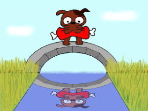 肉をくわえた犬が橋を渡っていた。