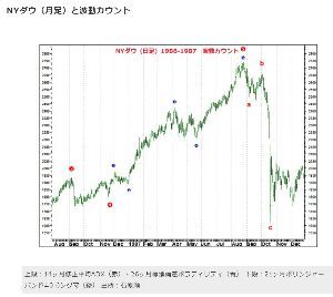 以下は1986年から1987年のブラックマンデーのチャートである。1987年の10月にブラックマンデーが起こっているが、相場が天井を打っても多くの人は下げの(a)のポイントで押し目買いをする。戻りの(b)でやっぱり押し目買いだと思うが、相場の上値が重くなって(a)のポイントを下回ると、相場はパニック的な売り(c)に見舞われる