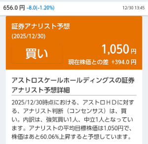 🦀で~とれさん🦀 こんにちは👋😃 レスありがとうございます🙇 大引けプラテンよろしくです~😊 ・・・・・・・・・・・・・・・・ 🌟 🌟 🌟 国策に売り無し 🌟 🌟 🌟 🌸 🌸 アナリストにウソ無し 🌸 🌸 2025/12/30時点における、アストロHDに対する、アナリスト判断(コンセンサス)は、買い。内訳は、強気買い1人、中立1人となっています。アナリストの平均目標株価は1,050円で、株価はあと60.06%上昇すると予想しています。 https://s.minkabu.jp/stock/186A/analyst_consensus