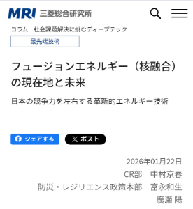 dorさん こんばんは👋😃 おそらくぶるさんの方がお詳しいと思いますが…😔 三菱総研のレポを見る限り、あまり関係ないような…😔 ・・・・・・・・・・・・・・・・ フュージョンエネルギー(核融合) の現在地と未来 https://www.mri.co.jp/knowledge/column/20260122.html