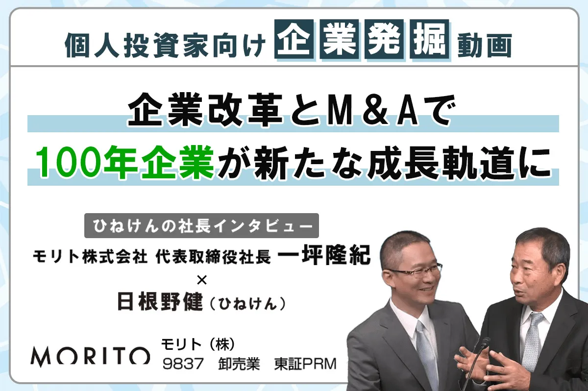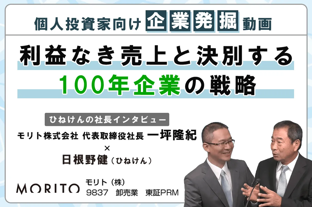 モリト<9837>は、1908年の創業以来、靴紐を通す穴などに取り付ける環状の金具のハトメ・ダウンジャケットのホック・車の内装などに使用されるマジックテープといったアパレル用副資材で世界トップクラスのシェアを誇る老舗企業です。本動画では、代表取締役社長 一坪隆紀氏に、公認会計士で株式投資チャンネルを運営する日根野健氏(ひねけん)が、売上1.5倍・営業利益2倍・株価3.8倍を達成した驚異の企業変革の裏側についてインタビューしました。「100年企業」という伝統に甘んじず、利益重視の経営と多角的な成長戦略で新たな軌道に乗った一坪社長の経営哲学をぜひご覧ください。