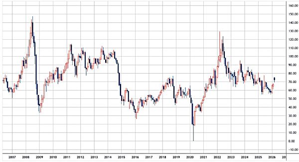 昨年(2025年)後半、原油価格は歴史的に見て、かなり低い水準にありました。そして、今年(2026年)に入っても依然として「安い」と言えるレンジに止まっていました。