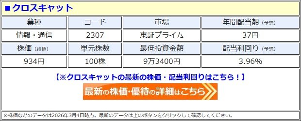 クロスキャットの2026年3月4日時点の株価(終値)は934円なので、配当利回り(予想)は以下のようになる。